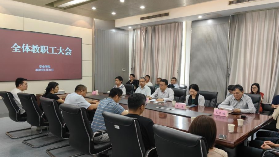 新任党委书记戴廷波、原党委书记李俊龙、原院长张炜,其他院领导及全体教职工参加大会。会议由陈洁主持。