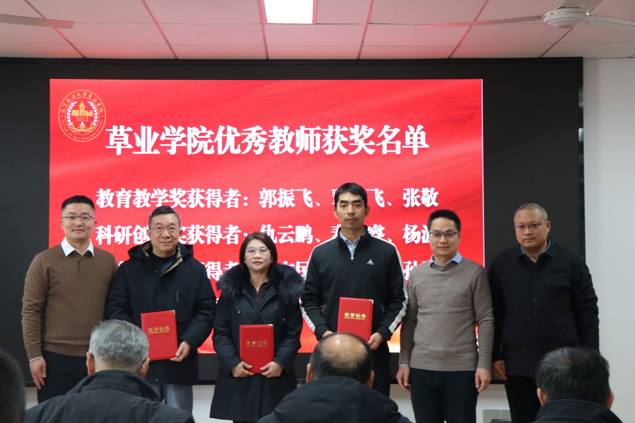 年会对在教育教学、科研创新、社会服务、管理服务等方面做出突出贡献的12位教职工进行了表彰,对盛彤笙草业科学奖教金、奖学金获得者进行了颁奖。尤佩华为获得饲草科学—波杜奖学金的同学们颁发了获奖证书。