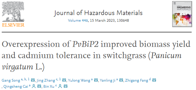 徐彬研究组和生科院蔡庆生教授合作在Journal of Hazardous Materials在线发表了题为“Overexpression of PvBiP2 improved biomass yield and cadmium tolerance in switchgrass (Panicum virgatum L.)”的研究性论文。