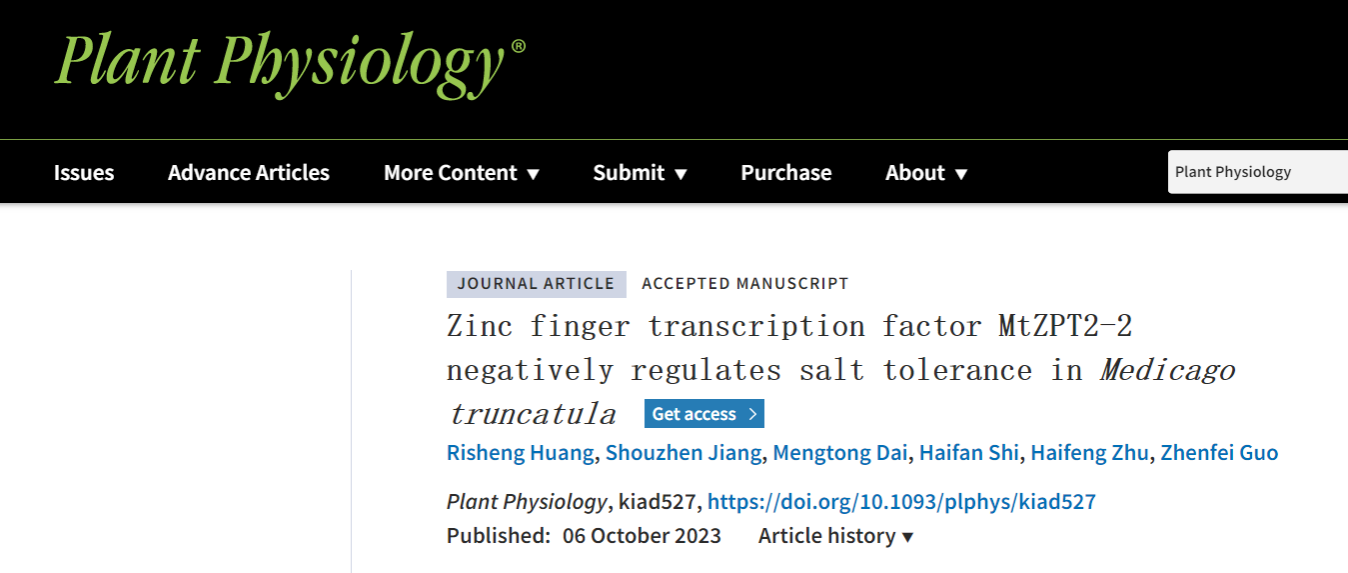 郭振飞教授团队在Plant Physiology在线发表了题为“Zinc finger transcription factor MtZPT2-2 negatively regulates salt tolerance in Medicago truncatula”的研究论文,揭示了锌指转录因子MtZPT2-2直接抑制高亲合性钾离子转运体MtHKT1;1和MtHKT1;2的表达负调控蒺藜苜蓿耐盐性的分子机制。