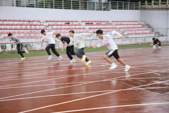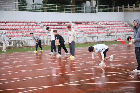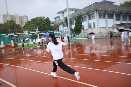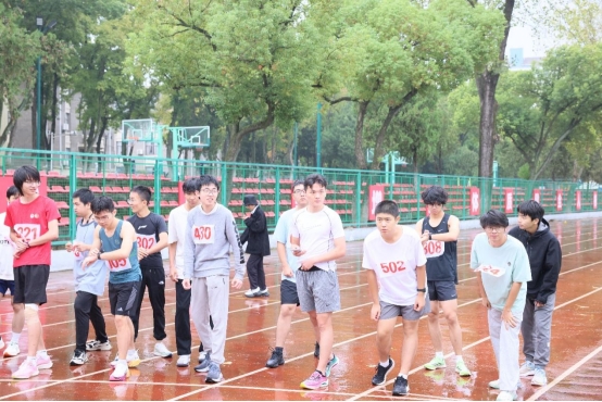 雨雾蒙蒙操场上,运动健儿齐争先。
