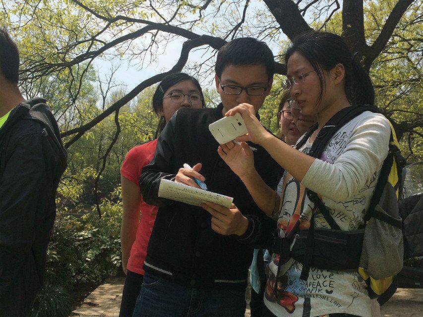 工作人员的准备工作刚结束,热情的同学们就已来到活动现场开始整装待发,跃跃欲试。也许是被参加活动的同学们的热情所感染,原本预报为阴霾的天气也变得晴朗。当工作人员通知活动开始,同学们就开始了激烈而有趣的竞速与寻找。除此之外,工作人员们还在各个活动点准备了花样繁多的任务给他们。世纪之吻、成语接龙、对联抄写、以及历史典故猜谜等有趣的小任务让大家在游戏中得到了乐趣与知识,学会了勇敢探索与团队合作。